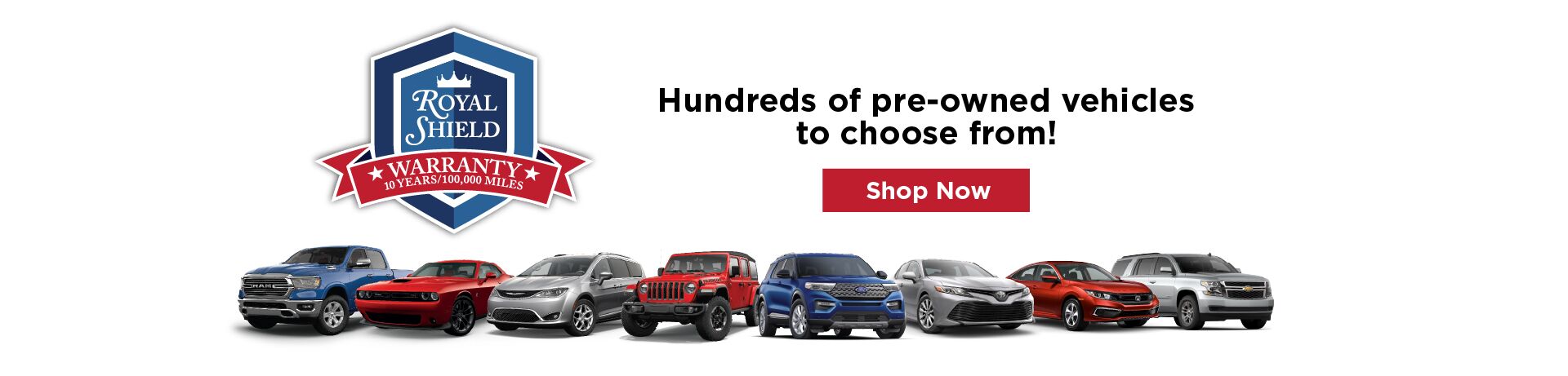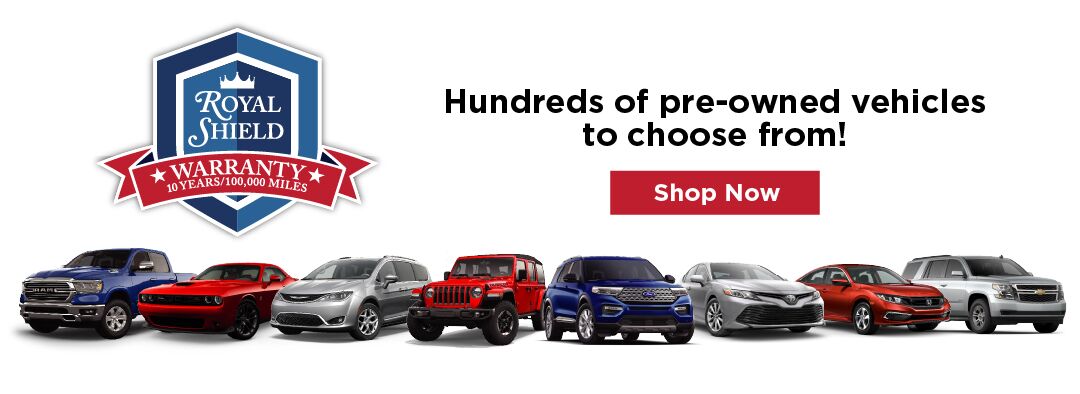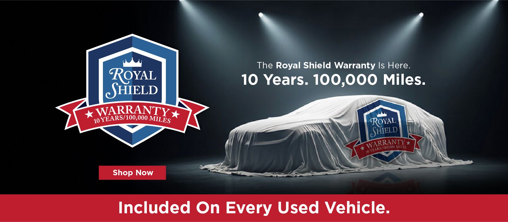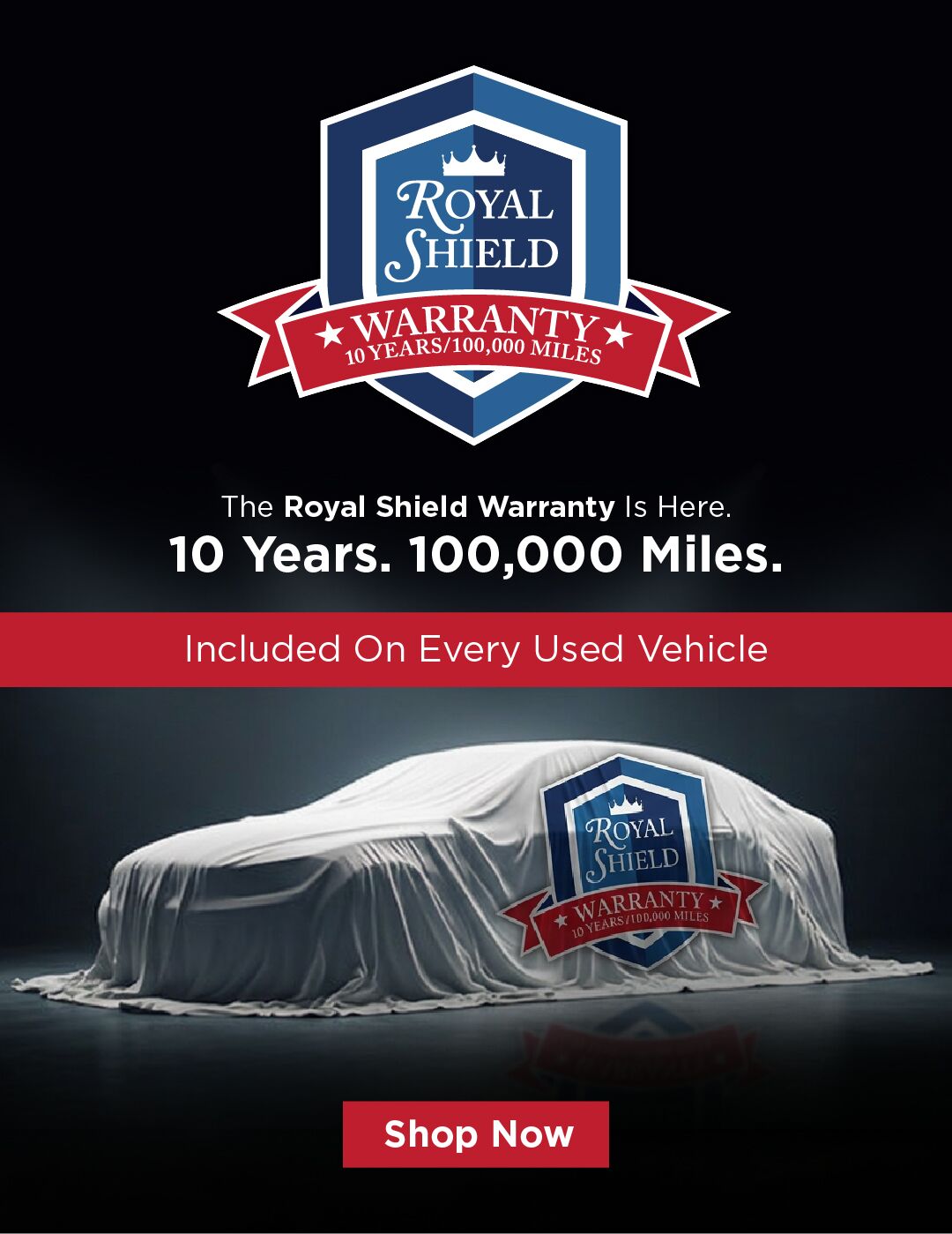 Every used car, truck, and SUV we sell is covered by the all-new Royal Shield Pre-Owned Warranty — 10 full years or 100,000 miles of powertrain protection, included with your purchase at no extra charge.